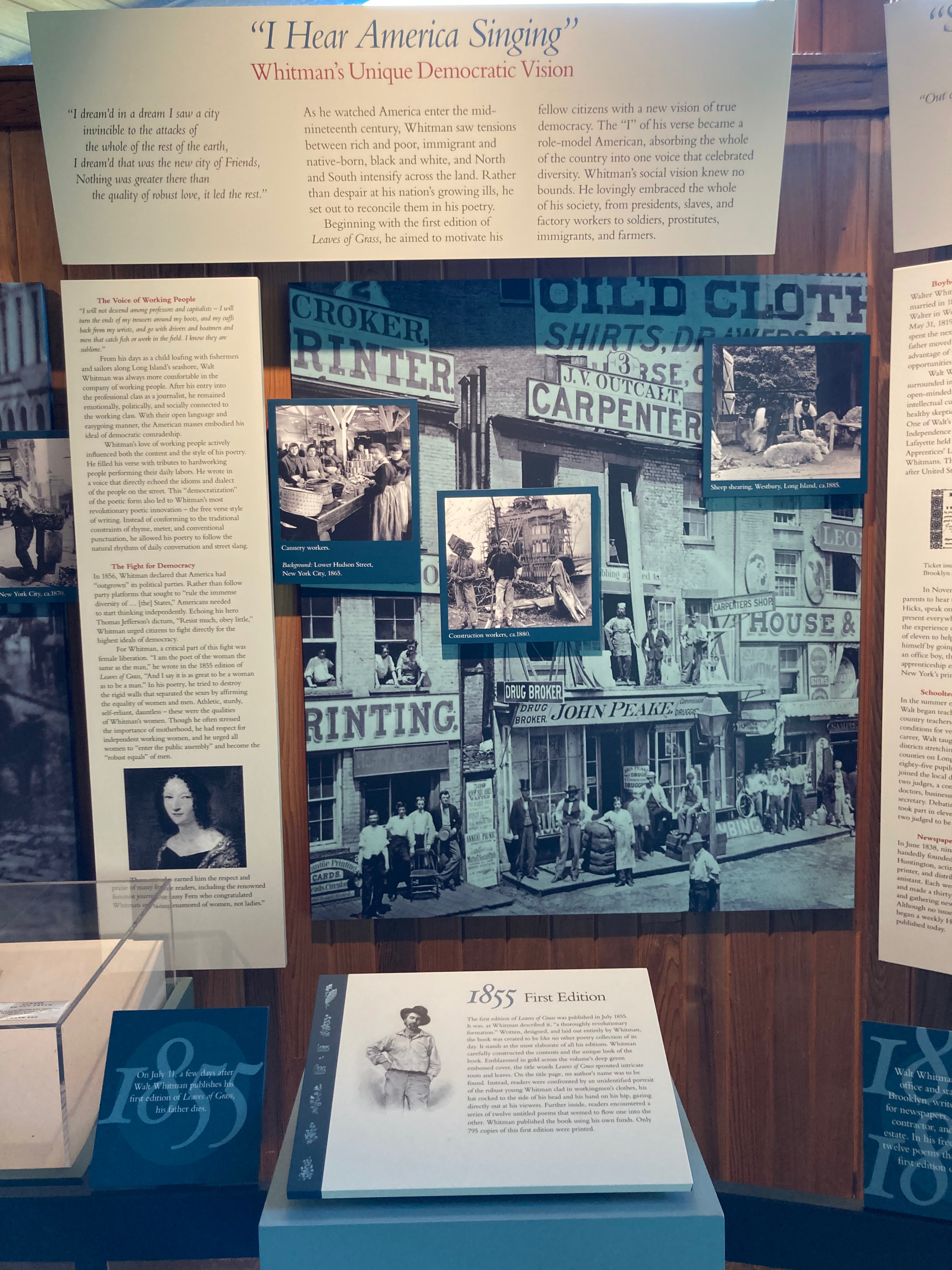 I explored the little museum in the visitor’s center and was interested to learn that the first edition of Whitman’s Leaves of Grass, published in 1855, did not feature the poet’s name on the cover or the spine. Instead, the green, leather cover showed only the title in gilded lettering with golden leaves sprouting from the letters. The cover page also did not indicate the author’s name and instead offered the reader only a rendering of the poet, a young, bearded man in workman’s clothes, his hat tilted, his pose relaxed. According to the information on display in the museum, Whitman set the type himself for the first edition and less than 800 copies of the book were printed.