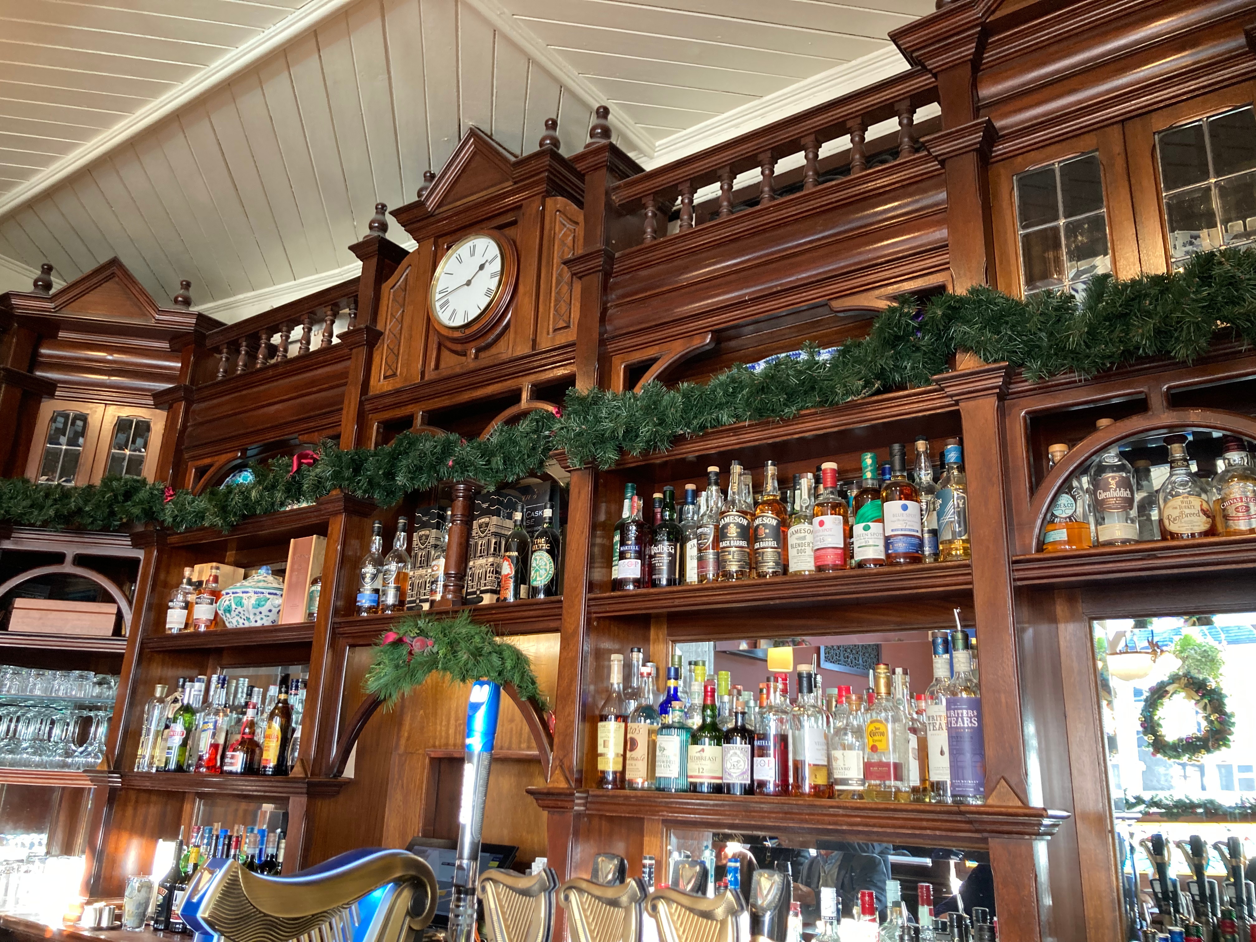 The Brazen Head, est. 1198, was a bit of a walk from Trinity, but once we got inside, it was pleasant, cozy, and very festively decorated. We snagged two seats at the bar and Mike ordered a Guinness and turned to me.